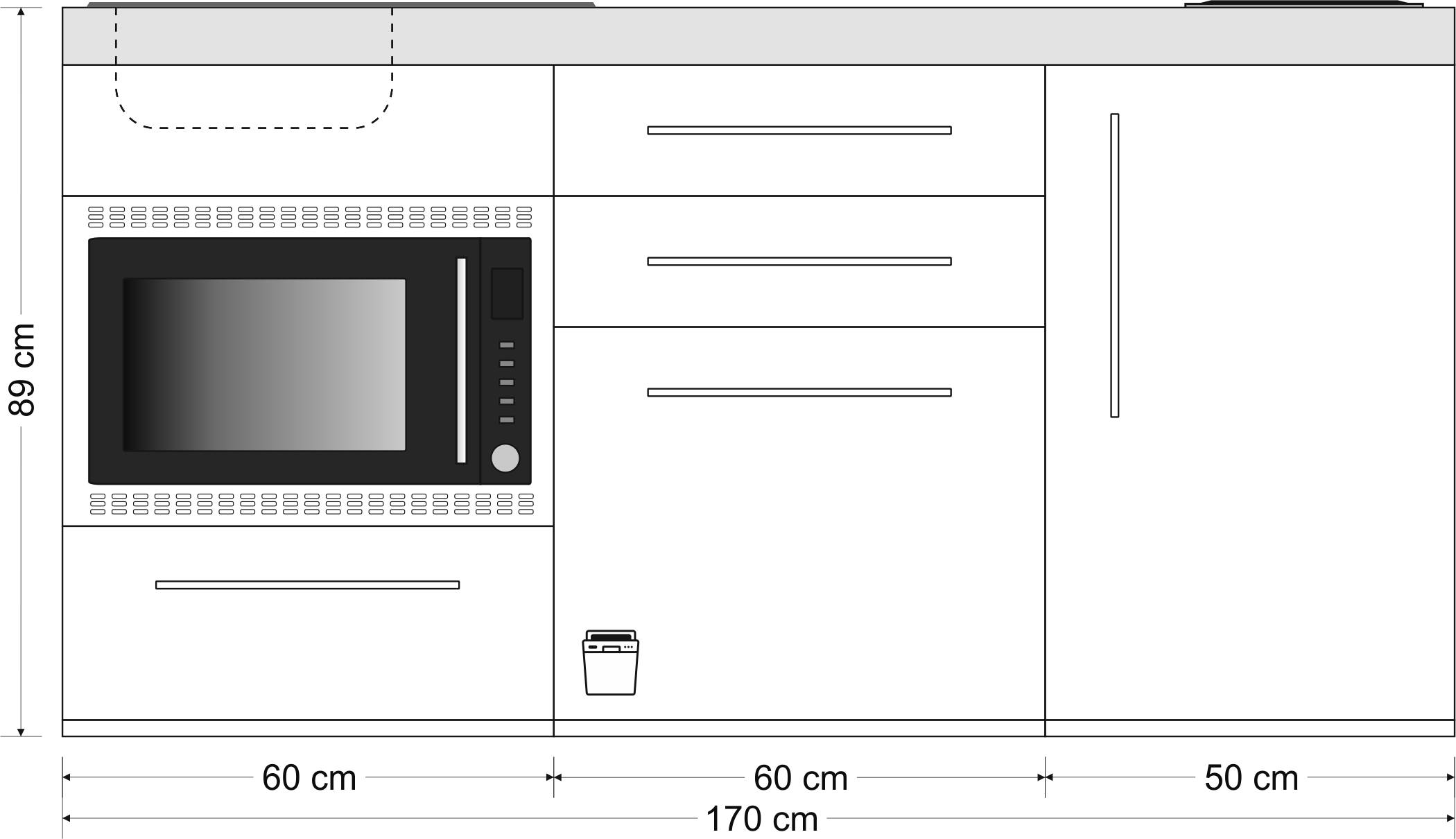 Die Miniküche MPGSMOS 170 aus der Serie Premiumline ist ein vielseitiges Modell, welches im Büro oder als Singelküche für den kleinen Wohnraum ihre Verwendung findet. Aufgrund ihrer kompakten Abmessungen (B/H/T: 170x89x60cm) eignet sich diese Küche optimal für kleine Nischen oder als offene Büroküche. Der Korpus der Miniküche MPGSMOS 170 wird aus Pulverbeschichtetem Metall gefertigt und verfügt über doppelwandig innen geschäumte Türen, was eine leichte Reinigung und Langlebigkeit gewährleistet. Die Küche besteht aus einem 600 mm Spülenunterbau mit Spülenblende, 1 Schublade mit Soft-Close und einem Geschirrspüler, einem 600 mm Backofenunterbau (Mitte) mit Schublade und Soft-Close inkl. einem Mikrowellenofen, sowie einem 500 mm Unterbau (Außen) mit Türe.