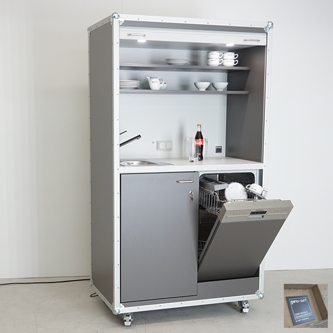 Die Pro Art Case Kitchen Version light ist für den leichten Einsatz innerhalb Ihres Gebäudes vorgesehen und wird aus einem Materialmix aus Sperrhölzern und Dekorplatten gefertigt. Durch eine Auswahl verschiedener Dekore kann der Küchenschrank so Ihren vorhandenen Möbeln angepasst und ergänzt werden. Sie benötigen mehr Staumöglichkeiten oder möchten Ihr Büro im modernen Design erweitern - auch hier können Sie auf die Serie der casekitchen bauen. Mit dem Beistellschrank kann weiterer Stauraum geschaffen werden oder elektrische Geräte wie ein Geschirrspüler den Küchenschrank ergänzen. Der Beistellschrank ist eine optimale Ergänzung zu Ihrem Küchenschrank. Auf Grund der Innenbreite von 45cm und vier variabel verstellbaren Einlegeböden bietet sich genügend Stauraum für Ihre Küchenutensilien. Der Beistellschrank wird wahlweise rechts, links oder auch beidseitig neben dem Küchenschrank aufgestellt und ergänzt diesen perfekt. Um Ihnen die tägliche Arbeit im Büro zu erleichtern kann der Beistellschrank mit einem integrierten Siemens Geschirrspüler ausgestattet werden. Bei dieser Variante entfällt die untere Drehtür mit den entsprechenden Einlegeböden und der Geschirrspüler für 12 Maßgedecke findet hier seinen Platz. Technische Daten casekitchen Beistellschrank: 192 x 54 x 66 cm H/B/T Die Farbkombinationen:Sie haben die Möglichkeit den Korpus light in verschiedenen Farben zu bestellen. Folgende Varianten sind verfügbar: Weiss, Grau, Schwarz, Buche, Nussbaum, Ahorn. Je nach Gehäusefarbe ergeben sich folgende Farbkombinationen für Front, Rückwand und Arbeitsplatte: Gehäuse: Dekor Weiss / Front: Fallrollo Weiss / Rückwand: Dekor Weiss / Arbeitsplatte: Dekor Weiss Gehäuse: Dekor Grau / Front: Fallrollo Grau / Rückwand: Dekor Grau/ Arbeitsplatte: Dekor Grau Gehäuse: Dekor schwarz / Front: Fallrollo schwarz/ Rückwand: Dekor Grau/ Arbeitsplatte: Dekor Grau Gehäuse: Dekor Anthrazit / Front: Fallrollo Grau / Rückwand: Dekor Grau / Arbeitsplatte: Dekor Grau Gehäuse: Dekor Buche / Front: Fallrollo Buche / Rückwand: Dekor Buche /Arbeitsplatte: Dekor Buche Gehäuse: Dekor Ahorn / Front: Fallrollo Ahorn / Rückwand: Dekor Ahorn / Arbeitsplatte: Dekor Ahorn Gehäuse: Dekor Eiche / Front: Fallrollo weiss / Rückwand: Dekor weiss / Arbeitsplatte: Dekor weiss Zubehör Beistellschrank 45cm: 01. Siemens SR 53HS64KEfür 45er Beistellschrank Siemens Einbau-Geschirrspüler teilintegriert, passend für 45 cm Beistellschrank; Preis inkl. Montage im Beistellschrank, Tür und Einlegeböden unten entfallen 02. Samsung DW50R4060BBfür 45er Beistellschrank, Samsung Einbau-Geschirrspüler, Energieklasse E, 6 Programme, 14 Maßgedecke, aqua Stop; Preis inkl. Montage im Beistellschrank 03. Aufpreis für Schubladenvier Schubladen für 45er Beistellschrank, Schubladen Zargensystem, kugelgelagerter Vollauszug, 30kg Traglast, Selbsteinzug, gedämpfte Schließung, oben drei gleichhohe Schubladen, unten eine höhere Schublade; Preis inkl. Montage im Beistellschrank 04. 2-fach Steckdose -Einbau2-fach Möbel Einbausteckdose für 45er Beistellschrank. Die Möbelsteckdosen, mit Klappe, werden in der Rückwand des Schrankes (oberhalb des Mittelbodens) integriert. Anschluss erfolgt über eine Zuleitung mit Schuko-Stecker; Preis inkl. Montage im Beistellschrank 05. LED-Einbauleuchten schaltbarzwei LED Einbauleuchten für 45er Beistellschrank, die LED-Leuchten werden im Deckel eingefräst. Schaltung über Druckknopf, Anschluss über Zuleitung mit 220 Volt Schuko-Stecker; Preis inkl. Montage im Beistellschrank