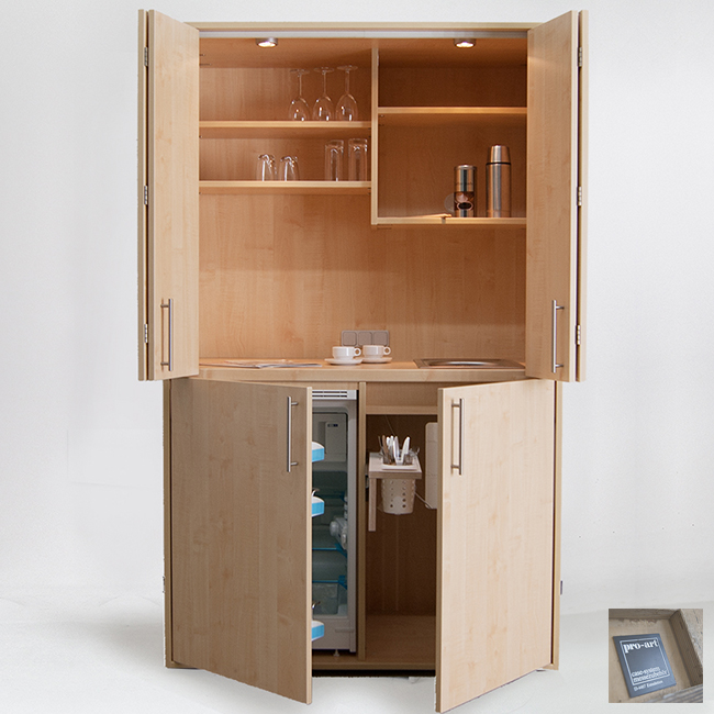 Der Wunsch, im täglichen Büro- oder Tagesablauf eine Tasse Cappuccino oder ein kühles Getränk zu genie-ßen, ist direkt in Ihr Büro integriert und auf kürzestem Weg zu erreichen. Sie benötigen mehr Stauraum für Gläser, Geschirr, Aktenordner oder Ihre Garderobe ??? - Kein Problem - Dank des modularen Systems kann der Küchenschrank beliebig nach Ihren Wün-schen zu einer Schrankwand oder einer kompletten Büroeinrichtung erweitert werden.