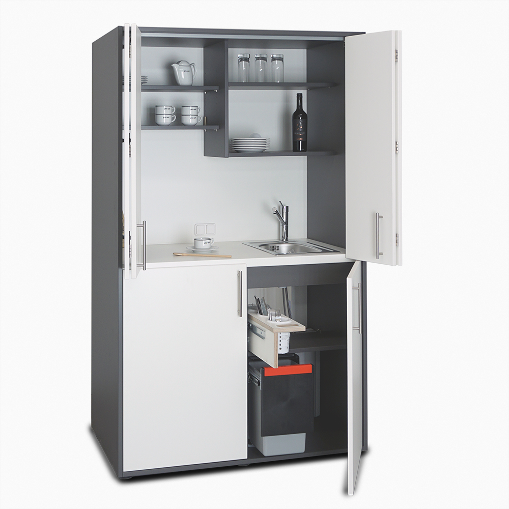 Der Wunsch, im täglichen Büro- oder Tagesablauf eine Tasse Cappuccino oder ein kühles Getränk zu genie-ßen, ist direkt in Ihr Büro integriert und auf kürzestem Weg zu erreichen. Sie benötigen mehr Stauraum für Gläser, Geschirr, Aktenordner oder Ihre Garderobe ??? - Kein Problem - Dank des modularen Systems kann der Küchenschrank beliebig nach Ihren Wün-schen zu einer Schrankwand oder einer kompletten Büroeinrichtung erweitert werden.