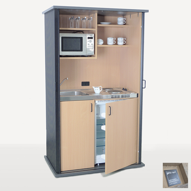 Das leicht laufende Kunststoffrollo wird zu den Seiten geschoben - und schon steht Ihnen die volle Funktion der Küche zur Verfügung. Bei der Zubereitung Ihres Cappuccinos, Kaffees oder dem täglichen Mittagssnack stehen Ihnen im geöffne-ten Zustand keine aufgeklappten Türen im Wege, wodurch die Schrankküche absolut platzsparend aufgestellt werden kann.