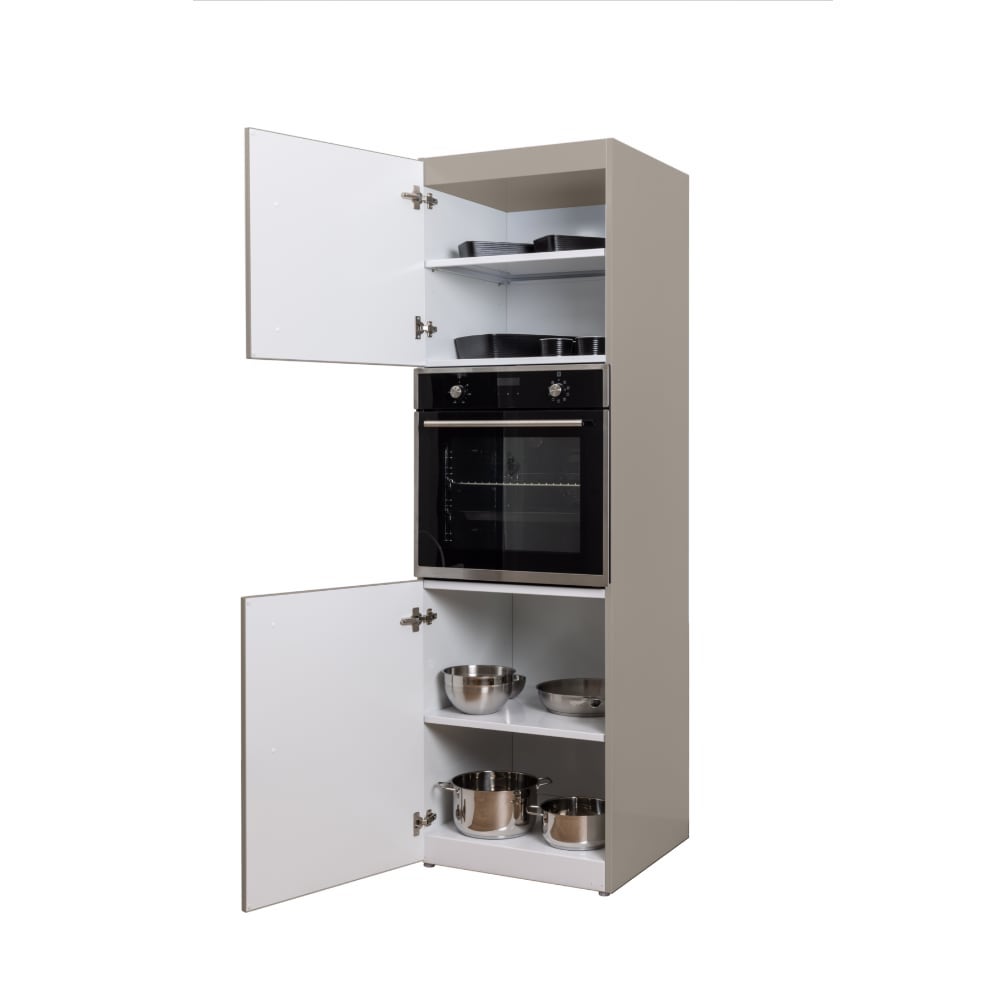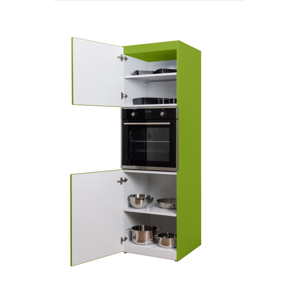 Tür und Korpus der Schränke sind aus pulverbeschichtetem doppelwandigem Metall mit Edelstahl Stangengriff. Der Hochschrank HOB ist mit einem Backofen in bequemer Arbeitshöhe ausgestattet, hinter jeder Tür befindet sich ein Einlegeboden.